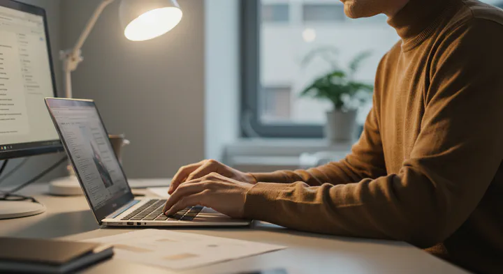 A professional brainstorming and choosing a memorable domain name on their laptop, ready to build their personal brand with a new website.
