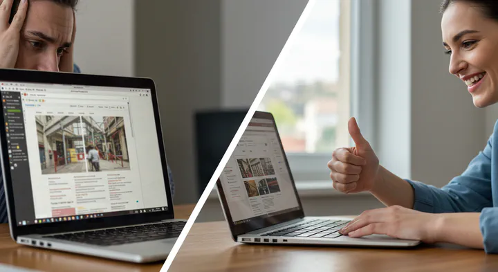A split image – One side showing a person stressed because they have no website, the other showing a person happy because they have a great website.
